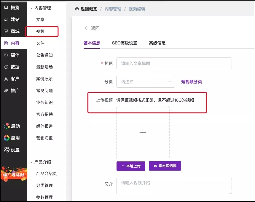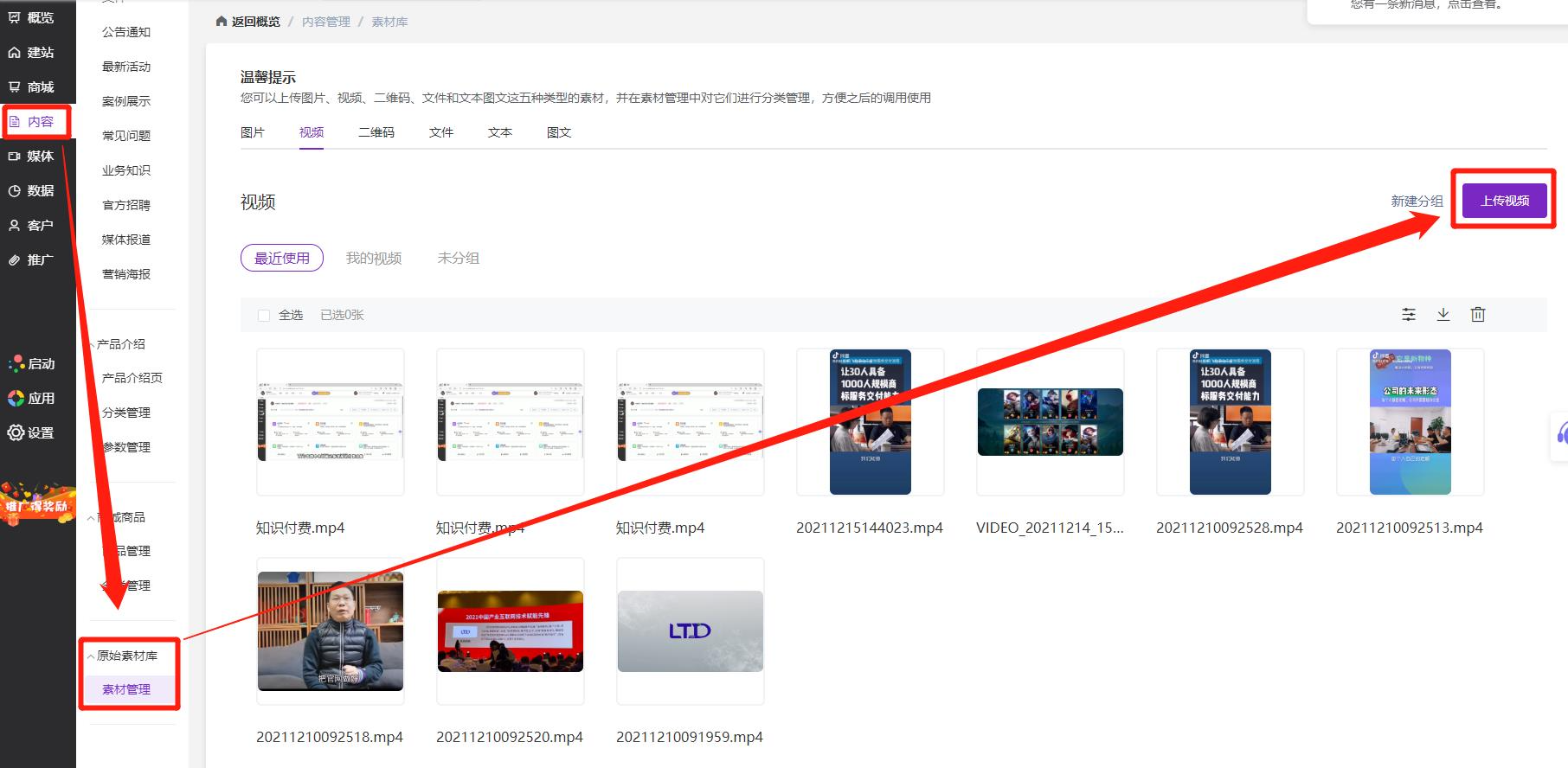 此外,你也可以把视频上传至官微中心后台的素材库中,这样一来无论是在之后编辑其他宣传物料,或是编辑企业官网页面时都可以自由调取出来使用;