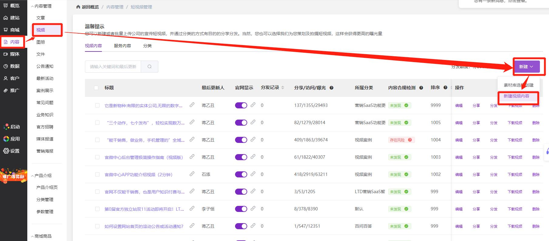 通过LTD上传视频的方式很简单,只需要打开官微中心,选择“内容-视频”,点击新建视频内容即可;