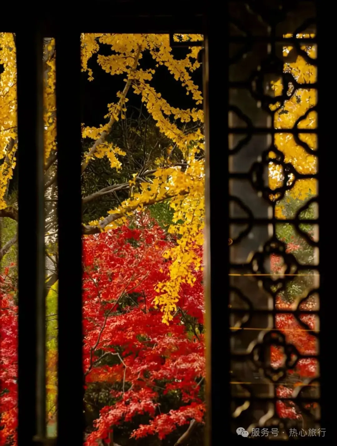 2、梧竹幽居:圆形框景框住秋色,长廊外的枫林也美