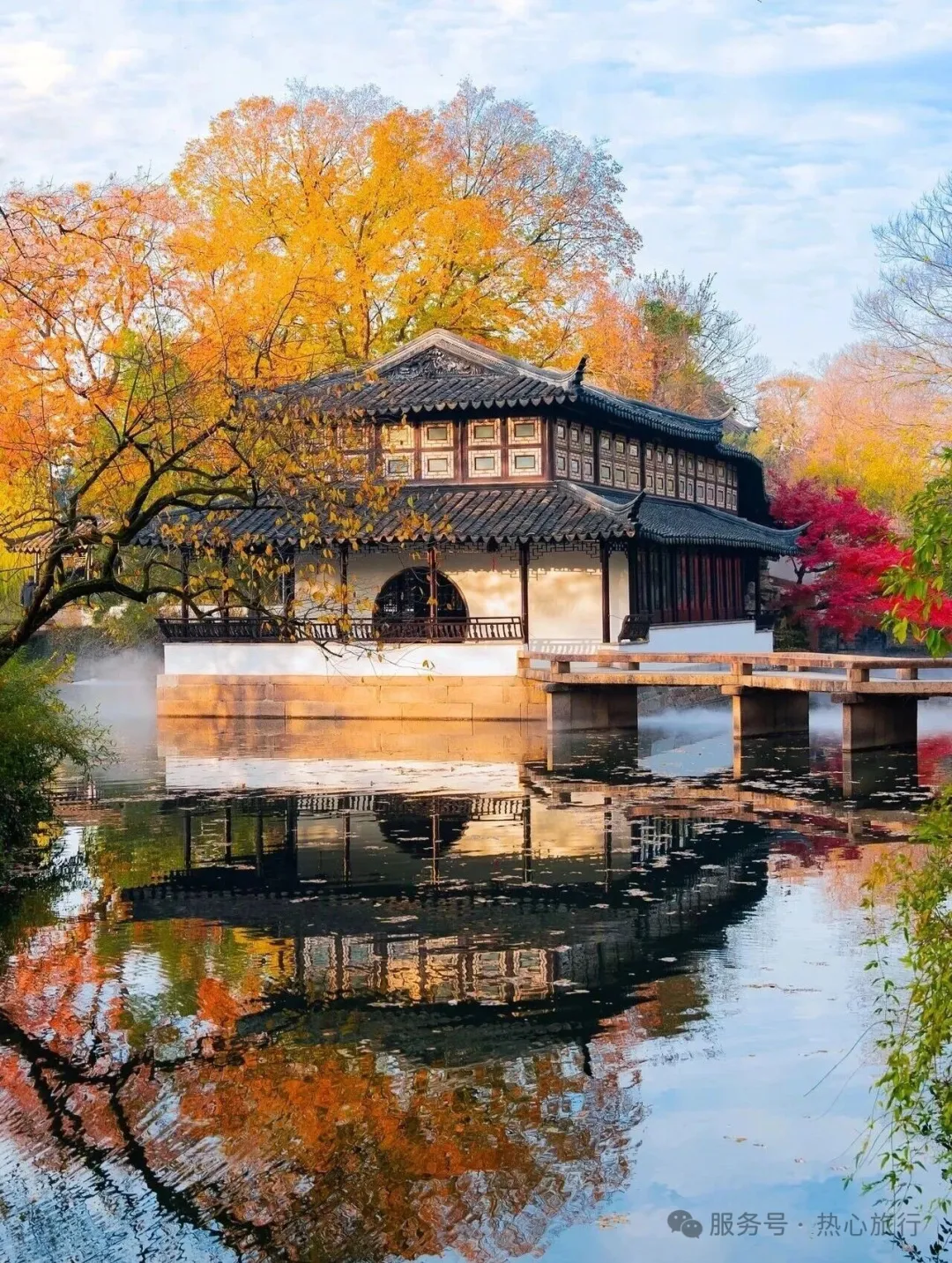 1、听雨轩旁:水中红枫独树一帜,“水色迷茫,天然野趣”