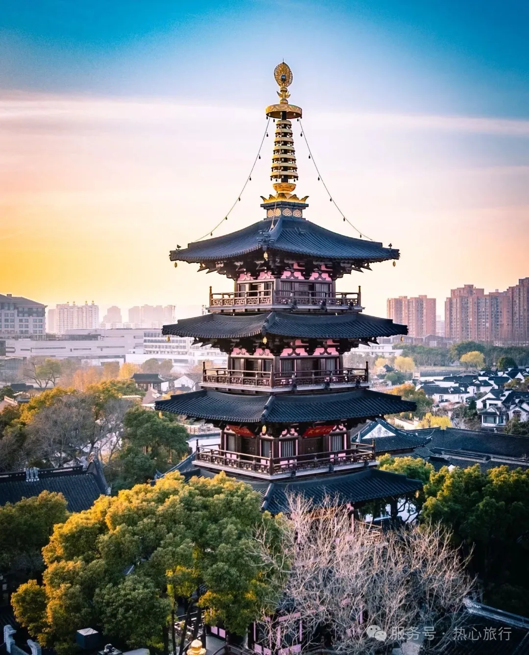 普明宝塔:寺内的制高点,可以登塔俯瞰苏州古城和运河风光。从塔的东侧仰拍,黄墙与蓝天的层次感超棒。