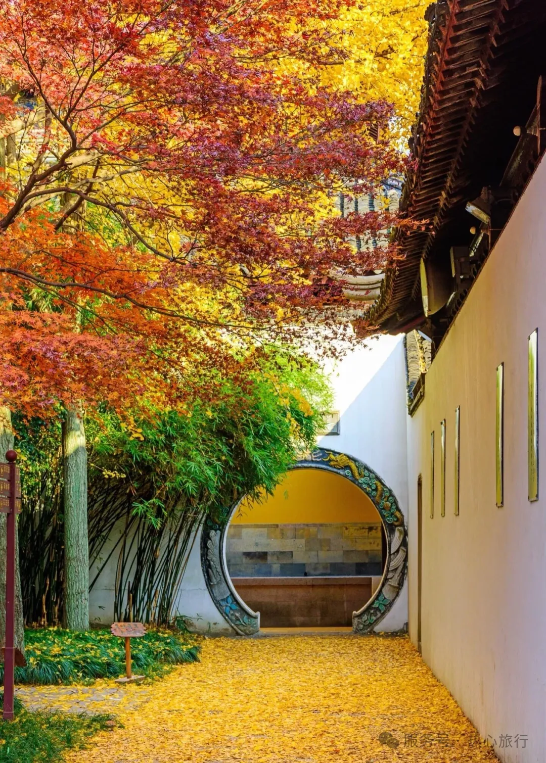 寒山寺照壁:寺外的黄墙大字是必拍的网红打卡点,尤其在秋冬季节,红枫、银杏与黄墙形成绝美撞色。