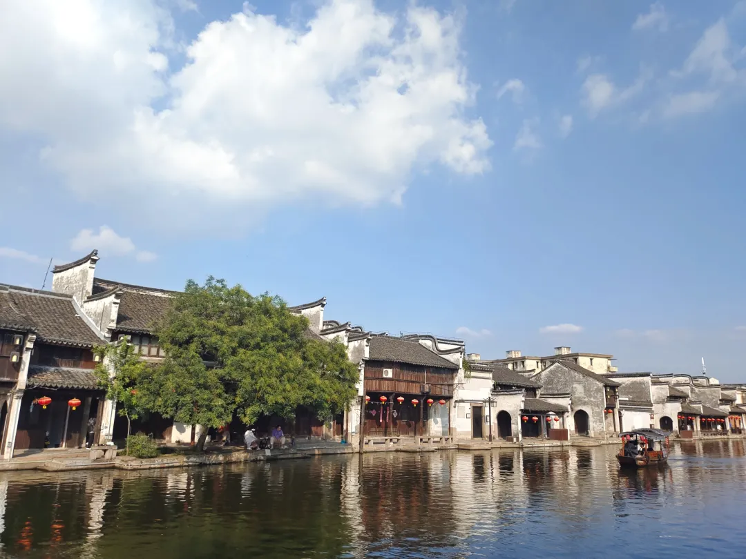 百间黑瓦白墙的民居沿河岸绵延,河水清澈见底,坐在廊下的椅子上看小船划过,非常放松。